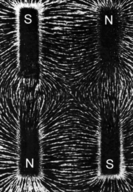 Making magnetic field lines visible: iron filings sprinkled on a pane of glass resting on two bar magnets are oriented by lines of force marking their directions and locations. They are concentrated at the ends of the magnet where the field is most intense.