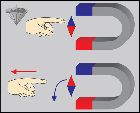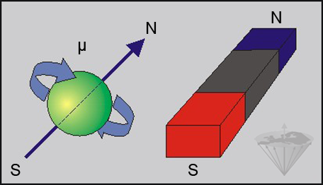 A spinning charged particle possesses a characteristic magnetic moment μ and can be described as a magnetic dipole creating a magnetic field similar to a bar magnet (N = north, S = south).