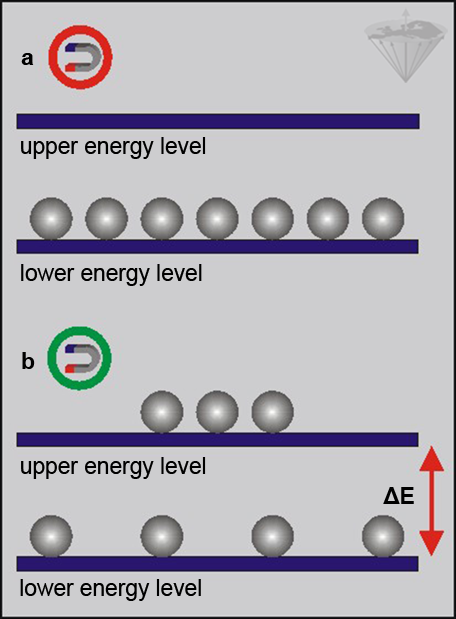 At equilibrium, we have a slightly larger population in the lower energy level, giving a net magnetization. To observe this population difference we have to provide an amount of energy equal to ΔE (the energy difference between the two levels).