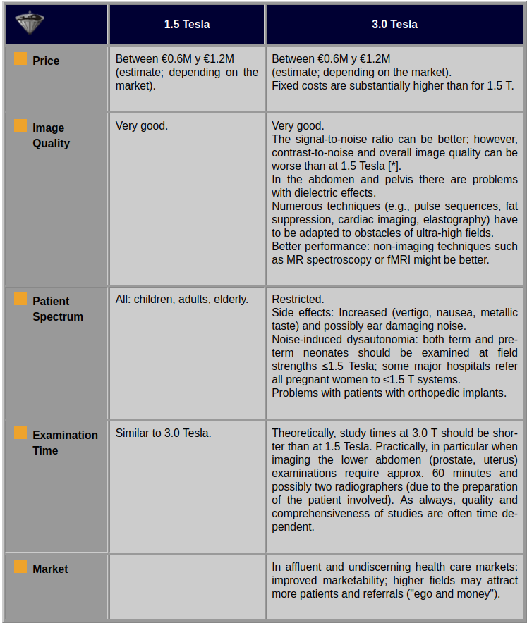 In the case of 1.5 Tesla versus 3.0 Tesla, one should weigh up the points in Table 03-03. It is unclear whether or not patients will receive different clinical management or experience different health outcomes when examined on an ultrahigh field machine [⇒ Wood 2012].
