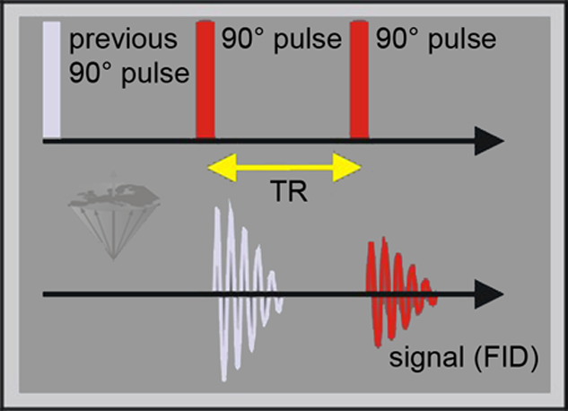 Pulse sequence diagram of a partial saturation sequence, consisting of 90° pulses. The time between the pulses is called repetition time, TR. When TR is not long enough for the spins to return completely to the equilibrium (i.e., TR < 5×T1), the signal intensity of the FID is lower than the maximal signal intensity possible.