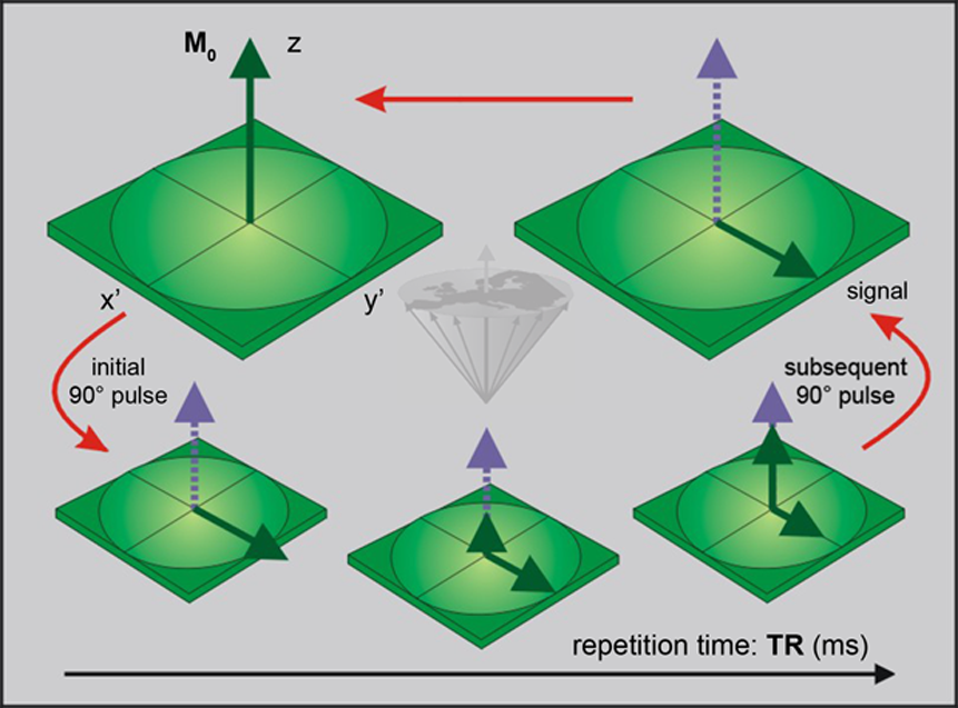 During the repetition time, TR, the system will relax and magnetization will start its return to the equilibrium state. To monitor the size of the magnetization, the system is exposed to a second 90° pulse.