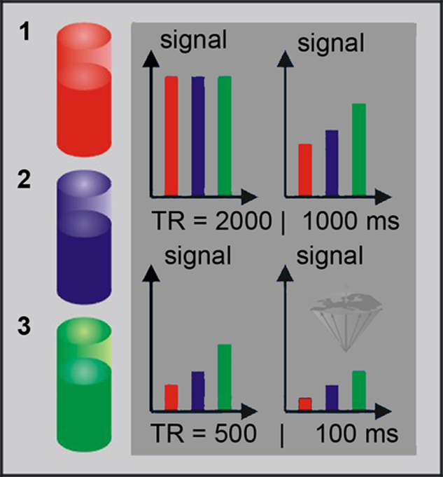Three different samples, (1) blood, (2) muscle, and (3) fat, assumed to have identical amounts of hydrogen but decreasing relaxation times, are exposed to a train of pulses with different repetition times TR. Note that the blood sample shows the most pronounced saturation behavior, since it has the longest T1.
