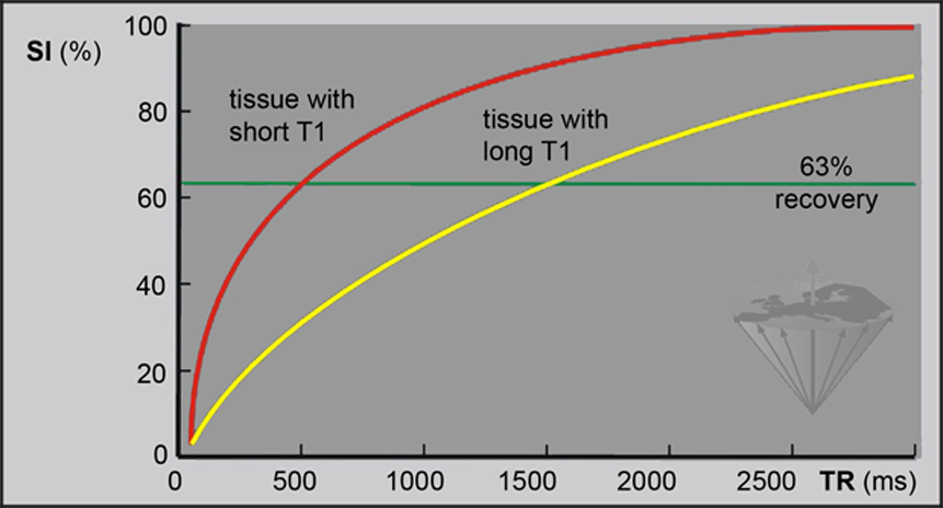The development of the signal intensity is depicted in Figure 04-13. When TR is not long enough for the spins to return completely to the equilibrium (i.e. TR < 5×T1), the signal intensity (SI) is lower than the maximal intensity possible.