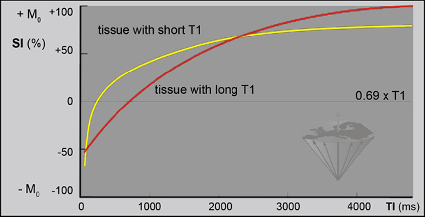 If a spin at equilibrium is subjected to a 180° pulse, the sum magnetization M₀ is inverted with respect to the direction of the external field and becomes antiparallel to the main magnetic field. Following the inversion, the magnetization starts to recover towards its equilibrium state. The recovery rate is determined by T1.