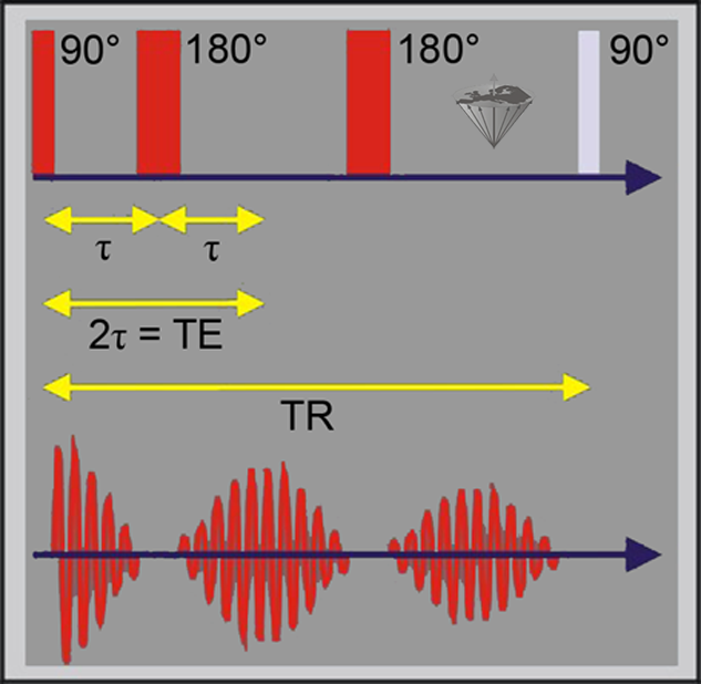 Spin-echo pulse sequence. The spin system is excited by a 90° pulse. After a time delay (τ), one or several 180° pulses follow. This leads to the formation of an echo. The time between the 90° pulse and the peak of the echo is the echo time TE (= 2τ). TR is the repetition time between two complete pulse sequences.