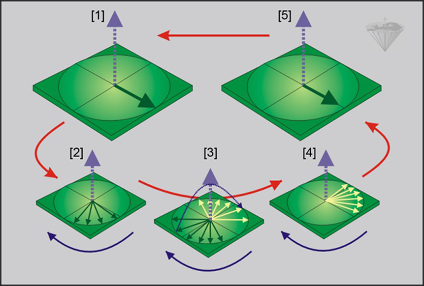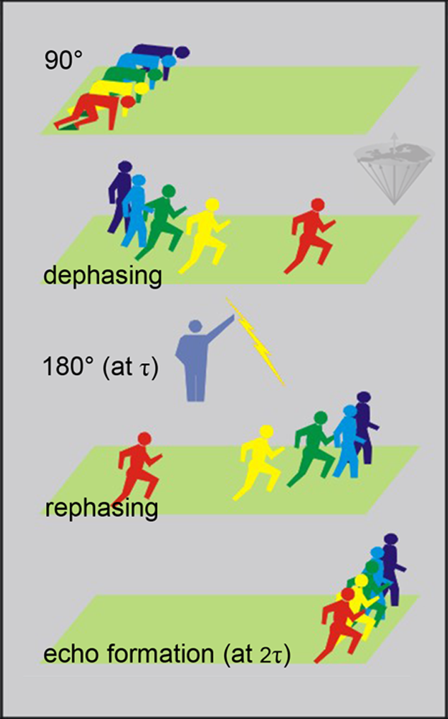 At the time of the 90° pulse, all runners are lined up at the starting line. After the 90° pulse, the faster runners separate from the slower runners (dephasing). At a certain time during the race, the runners are transposed (at the time τ when the 180° pulse is transmitted). Now the faster runners are behind the slower ones, but they catch up.