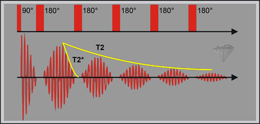 The value of T2* can be obtained from the FID of single echoes while T2 is calculated from the peaks of the echo amplitudes. Several 180° pulses create echoes of decreasing amplitude (multiecho sequence). The envelope curve drawn through their peaks is the T2 decay curve.