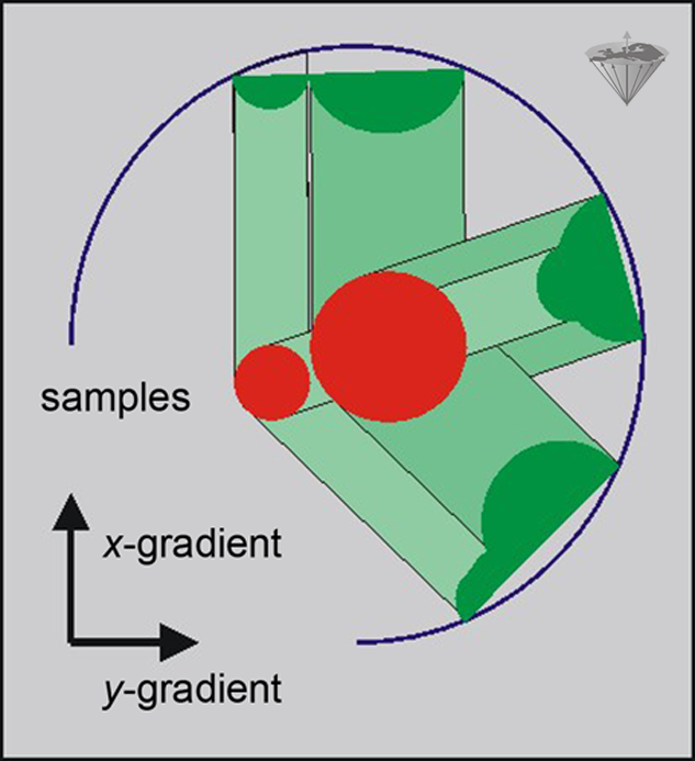 Let us consider two water samples. They are displaced in both the x- and y-directions. When we apply only a gradient in the x-direction, we do not gain enough information to deduce their position in space.