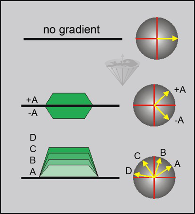 The phase angle induced by a gradient depends on both the amplitude and the duration of the gradient. When using a constant duration for the gradient, we can control the phase angle by varying the amplitude (A-D) and polarity of the gradient (+A, -A).