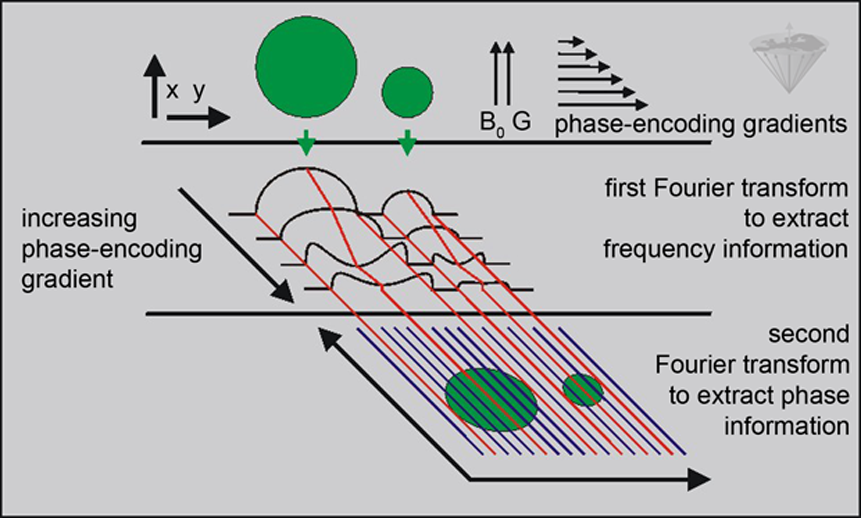 The first step generates a one-dimensional projection, but here a phase-encoding gradient is applied just before the original gradient is turned on. The phase-encoding gradient is applied in right angles to the original gradient and its duration or amplitude is successively increased. The corresponding points from each projection are Fourier-transformed a second time to generate the final image.