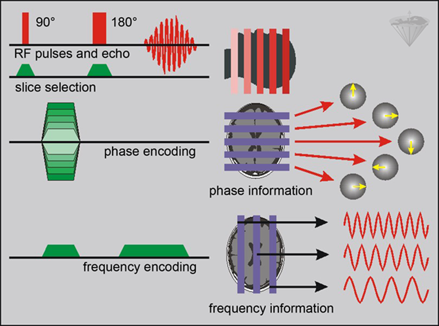 Complete 2DFT SE imaging experiment. The procedure consists of the selection of the 90° and 180° RF pulses, a transverse slice through a brain (z-direction), phase-encoding (y-direction), and frequency-encoding (x-direction).
