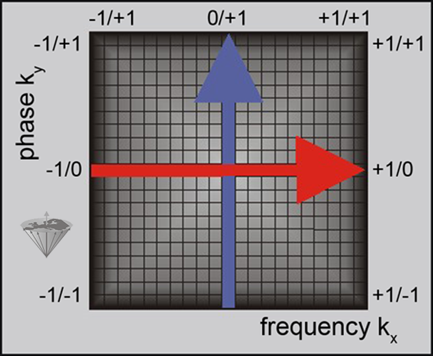 The coordinates of k-space are called spatial frequencies (measured in cycles per millimeter). They are filled depending on gradient strength of the frequency-encoding gradient (readout gradient: red arrow; x-direction) and phase-encoding gradient (preparation gradient: blue arrow; y-direction), moving from low gradient strength (-1) to zero gradient strength in the center (0) and high gradient strength (+1).