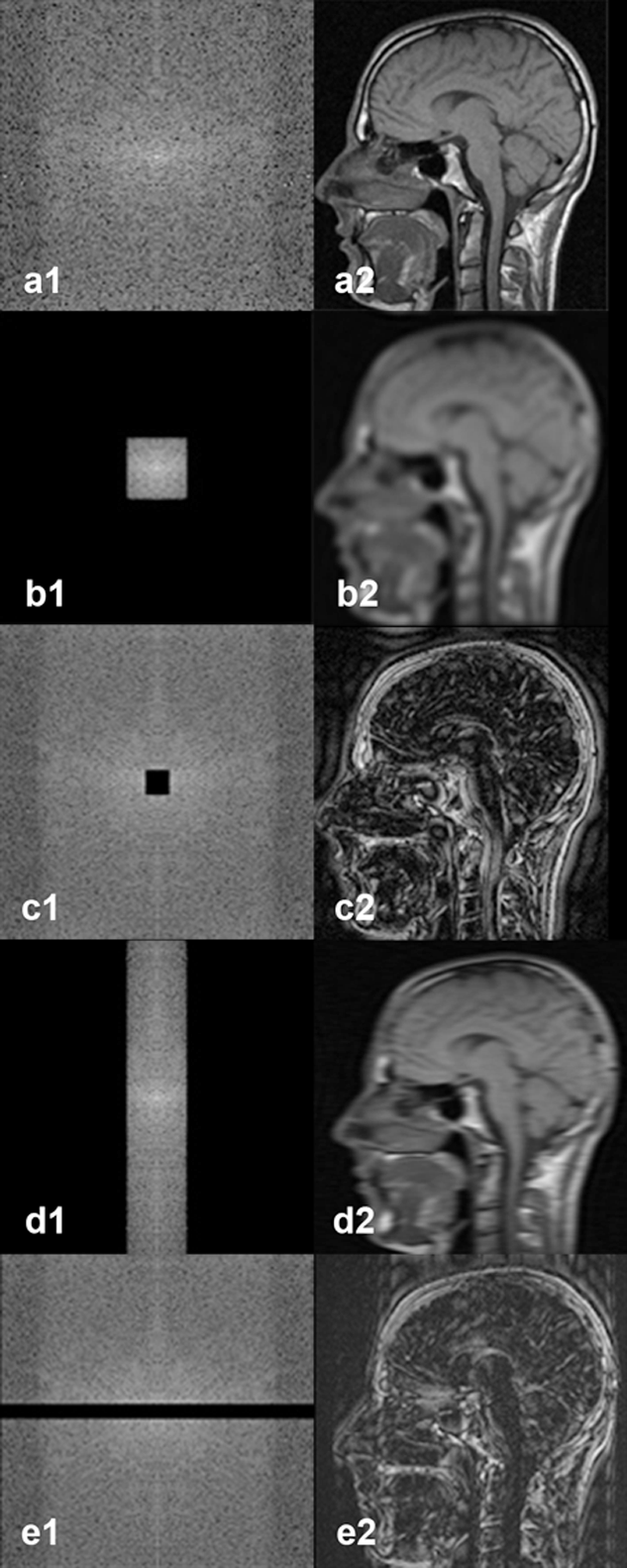 b1|b2: Same k-space as in (a) with filtering of the high frequencies; the reconstructed image has lost sharpness, it looks blurred, yet image contrast has hardly been affected.