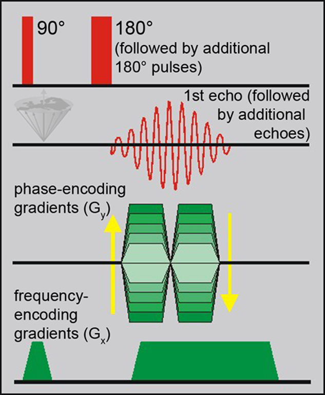 The RARE pulse sequence. A train of echoes is created and each echo is individually phase-encoded. Usually eight to sixteen echoes are used. There are several different variations with different styles of gradient switching.