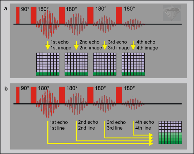 A comparison of (a) a multiple spin-echo and (b) a RARE sequence.