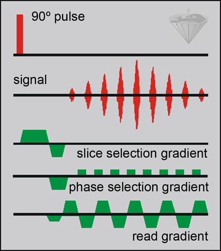 EPI was proposed by Peter Mansfield in 1977 [⇒ Mansfield 1977]. It is based on the principle of a single excitation of the spins, followed by the rapid switching of a strong, high-performance gradient to form a series of gradient echoes, each of which is given a different degree of phase-encoding and thus can be reconstructed to form an image.