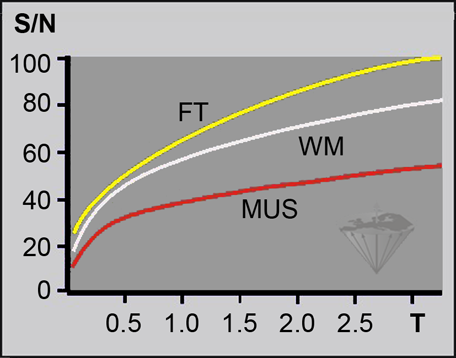 In clinical MR imaging, the ratio of signal-versus-noise versus field flattens out beginning at approximately 0.2 Tesla, resulting in diminishing gains with increased field strength (Figure 09-09).