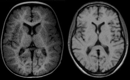 Brain images of (a) an infant of 11 months, and (b) an adult at 0.5 T. The same pulse parameters were used (SE: TR = 500 ms, TE = 20 ms). Windowing is slightly different.