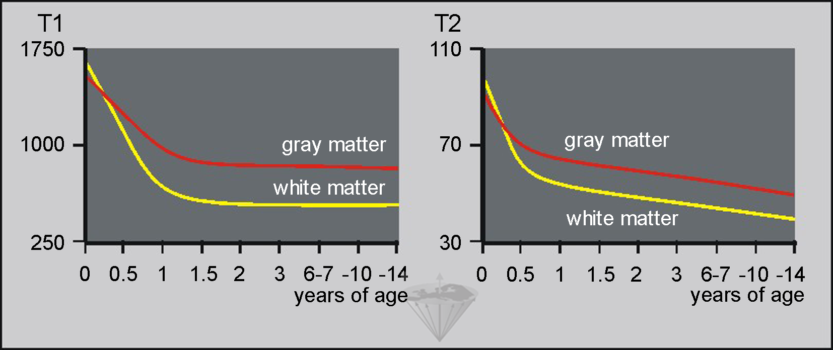 Consequently, T1 and T2 relaxation times of brain tissue decrease. At birth, the infant brain consists of 93-95% of water and has long T1 and T2 relaxation times (Figure 09-12). There is a fast fall in water content to 82-84% during the first two years of life as myelination takes place.