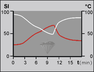 Drastic change of temperature. The white curve shows the decrease of signal intensity of a T1-weighted pulse sequence before, during and after local heating (red curve) of brain tissue in an ex vivo experiment. The temperature changes from 25° C to more than 60° C; relative SI drops by 50%.