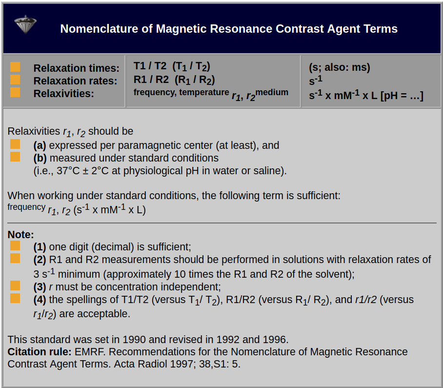 To be able to develop and compare contrast agents there has to be agreement of how their properties should be measured. Table 12-01 summarizes the latest version (1997) of the Standard Nomenclature of Magnetic Resonance Contrast Agent Terms for relaxation times, relaxation rates, and relaxivities [⇒ EMRF 1997].