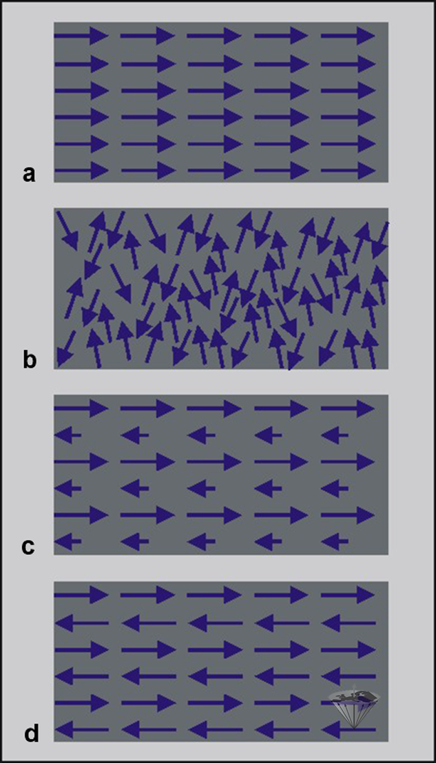 Antiferromagnetic materials consist of elementary magnets coupled together in opposite directions, resulting in zero net magnetization (Figure 12-02d).