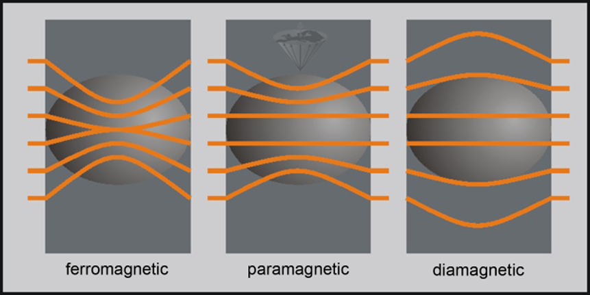For diamagnetic material, the value of susceptibility is always negative; for paramagnetic, superparamagnetic, and ferromagnetic substances positive. Figure 12-03 shows the response of diamagnetic, paramagnetic, and ferromagnetic substances to an outside magnetic field.