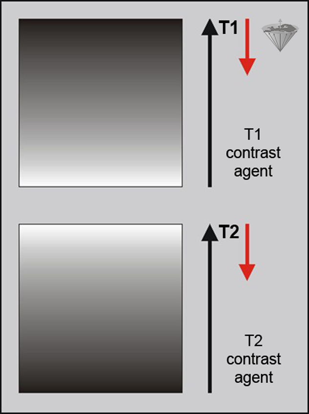Paramagnetic contrast agents, with the exception of dysprosium-based preparations, are called positive agents. Their effect on T1 and T2 is similar, but since T1 of tissues is much higher than T2, the predominant effect at low doses is that of T1 shortening. The principle was shown in Figure 04-05.