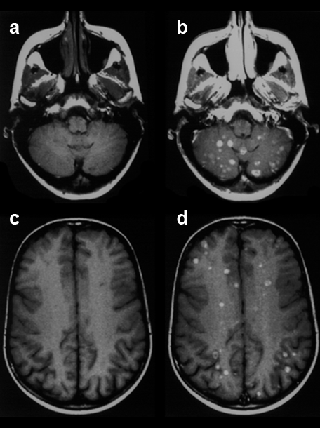This figure gives an example of a clinical case where finally the application of such a positive contrast agent helped the diagnostic process and showed the extent of the disease: Patient with breast cancer and recent neurological symptoms. T1-weighted images. The plain MR images (precontrast: a and c) do not reliably reveal brain lesions. However, the contrast-enhanced MR images (postcontrast: b and d) show a large number of metastases.