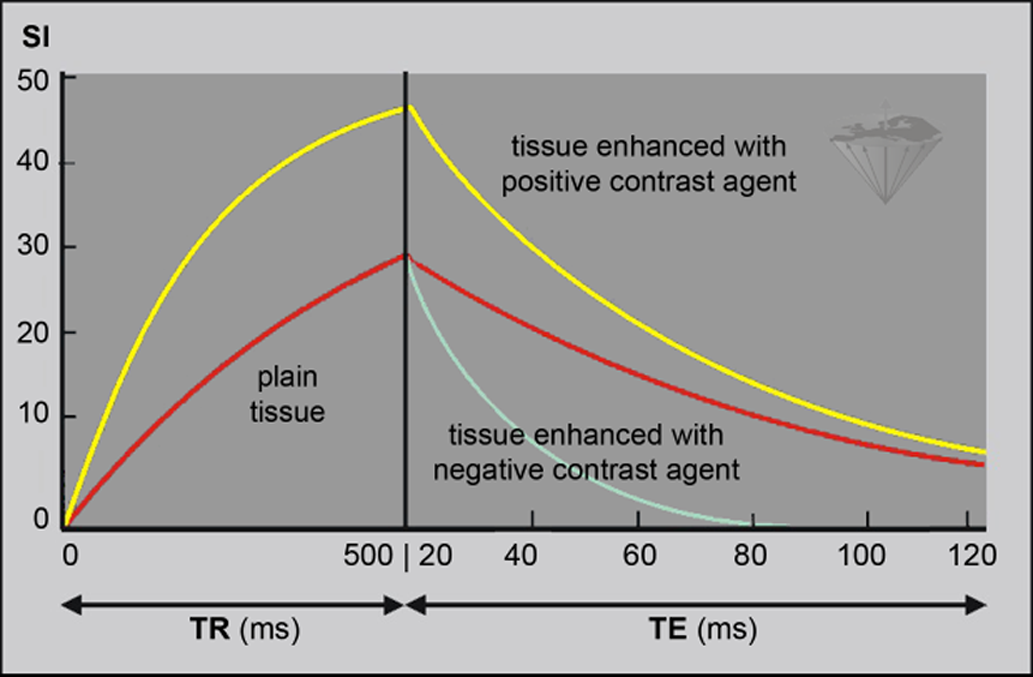 With negative contrast agents, T2 relaxation is accelerated; signal intensity is lower (light blue curve; in the "TR" part of the graph this curve overlaps with the red curve).