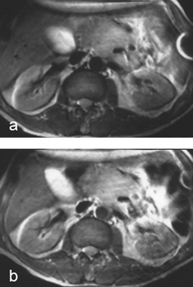 A number of substances were proposed and studied during the last years in phantom, animal, and clinical trials. Among them were positive and negative contrast agents. Gadolinium-containing contrast agents belonged to the first group, while fluorine-containing compounds and magnetic particles are found in the second group (Figure 13-16) [⇒ Hamm 1992, ⇒ Rinck 1991]. For studies of the upper abdomen blueberry or pineapple juices are also useable.