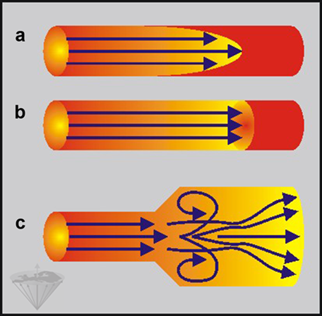 (a) Laminar flow, (b) plug flow, and (c) laminar flow turning into vortex and turbulent flow after a vascular stenosis. Laminar flow is relatively slow, plug flow, as a special form of turbulent flow, is faster.