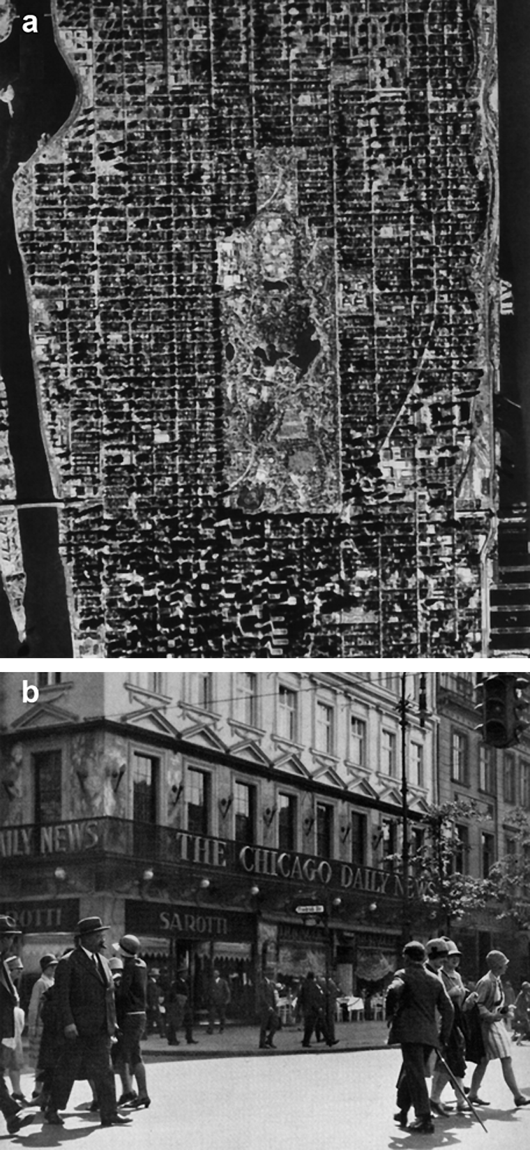 (b) When: Correct — before World War II (in 1928). Where: You are wrong — not in Chicago (even if there is a commercial for the Chicago Daily News), but in Berlin (at the corner of Unter den Linden boulevard and Friedrich Strasse in the city center).