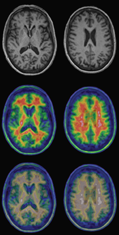 Center and bottom: PET-MRI fusion images of the same person. The upper row of the pseudo-color images shows the normal images; the lower row shows the same images as seen by a person with red-green deficiency (deuteranomaly).