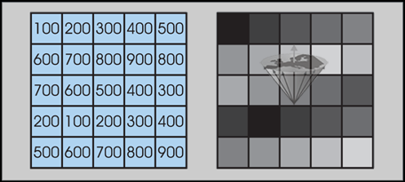 Numerical image date output (left) turned into gray-scale image (right). Typically, one finds medical images with an image matrix of 256×256, 512×512, or 1024×1024 and 256 gray levels.
