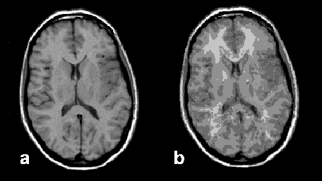 Image segmentation: (a) original brain image, and (b) segmented image presenting 90 different tissue components.