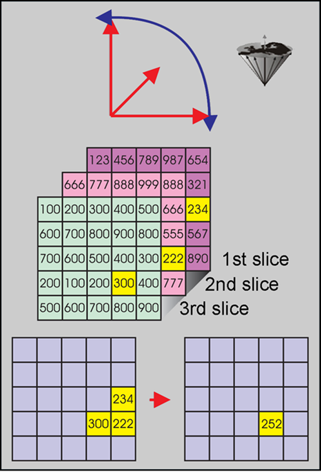 Bottom: Pixels have to be realigned for image-processing and analysis. Anatomically, the yellow pixels correspond to the same voxel, but have a different location on the slices.