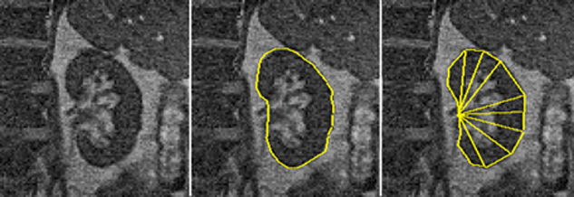 Center: The boundaries of the kidney can be manually drawn and adjusted in each image of the examination series.