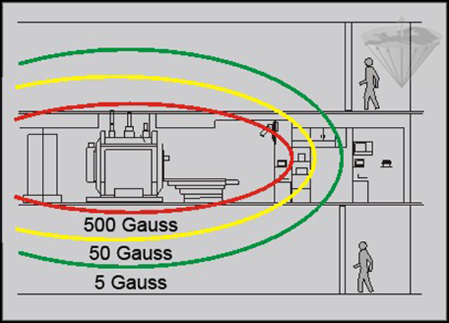 The fringe field around the magnetic resonance system may stretch into adjacent rooms, floors, even gardens and parking places outside the building. It both influences electronic equipment and can be a possible hazard to persons passing by. The official 5-Gauss safety line encircles the area that pacemaker carriers should not enter. This region can stretch beyond the magnet room itself. The entrance to the magnet room should be visible to the systems operator.