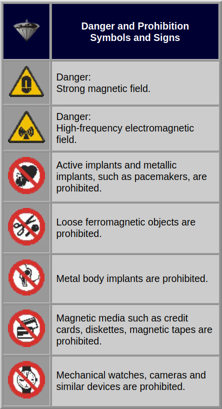Danger and prohibition symbols and signs used worldwide at MR installations.