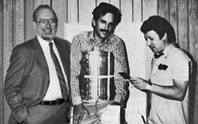 After more than four hours in the prototype machine at Paul C. Lauterbur's lab: The first three-dimensional ECG-triggered images of the heart, 1982. From left to right: Paul C. Lauterbur, Peter A. Rinck, and Robert N. Muller.