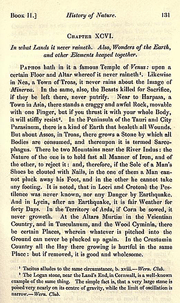 Pliny's original text in Latin: "Duo sunt montes iuxta flumen Indum: alteri natura ut ferrum omne teneat, alteri ut respuat, itaque, si sint clavi in calciamento, vestigia evelli in altero non possint, in altero sisti …"