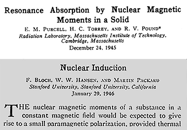 The headlines of Purcell’s and Bloch’s papers: Purcell's paper reached the Physical Review at Christmas Eve 1945, Bloch's short communication arrived four weeks later, in January 1946.