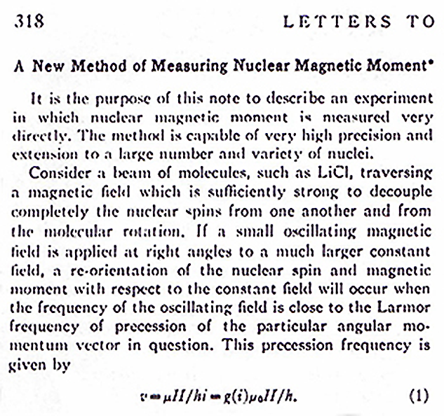 Beginning of Rabi's article about his first observation of nuclear magnetic resonance (1938). In a footnote he stated how indebted he was to Gorter and his idea of how to run the experiment.