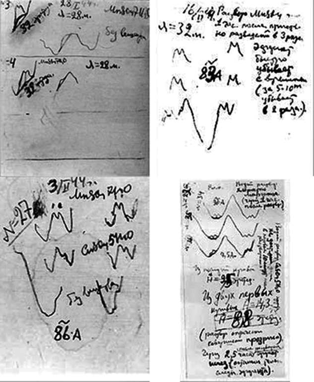 Pictures of the first ESR signals as copied from the screen of Zavoisky's oscillograph in 1944 (Picture source: Memorial Laboratory of Yevgeni K. Zavoisky at Kazan State University).
