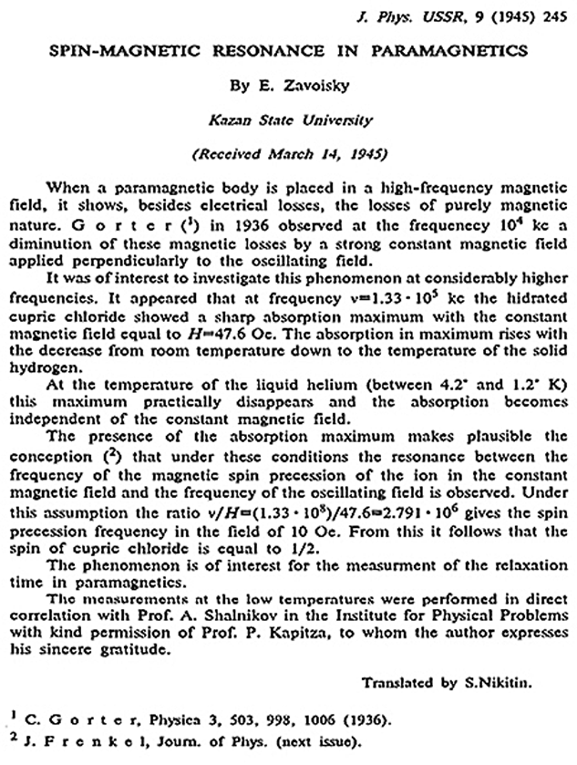 Zavoisky's publication from March 1945: "Spin-Magnetic Resonance in Paramagnetics” (English translation) in which he refers to Gorter.
