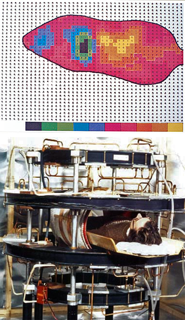 (Bottom) The prototype whole-body MR machine in Aberdeen. James Hutchison (1941-2018) lies in the magnet.