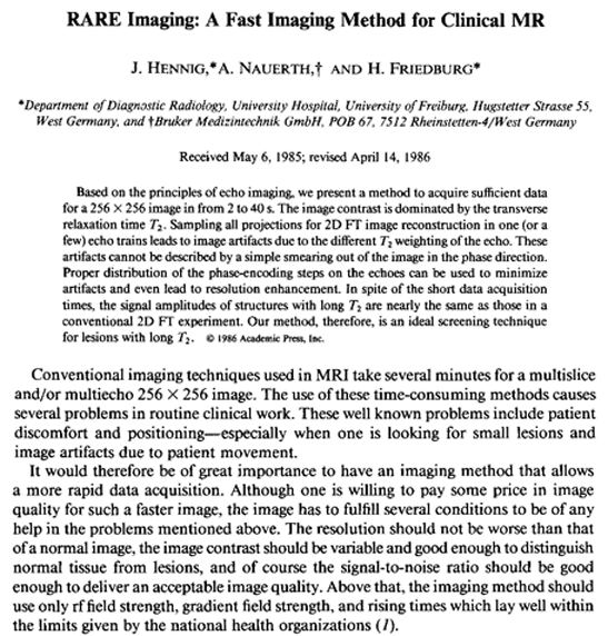 First page of Hennig's article about RARE imaging (submitted in 1985, published in 1986).