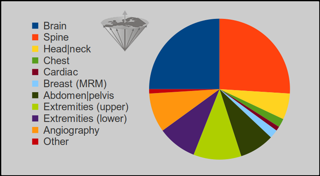 Spine 26%; brain 25%; head and neck 6%; upper extremities 11%; lower extremities 9%; abdomen and pelvis 8%; chest 2%; breast (MRM) 2%; cardiac 1%; angiography (MRA) 9%; other ≤ 1%.
